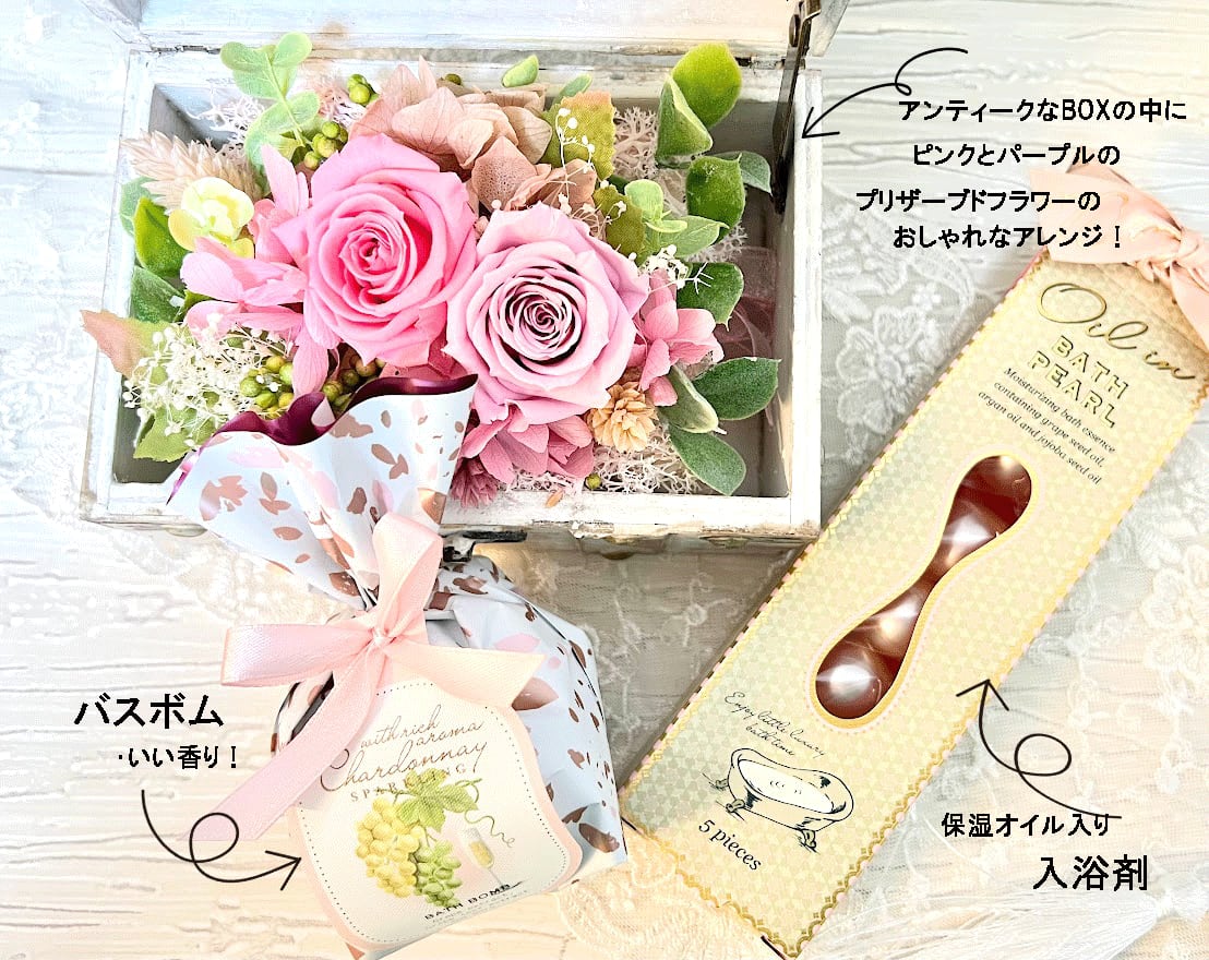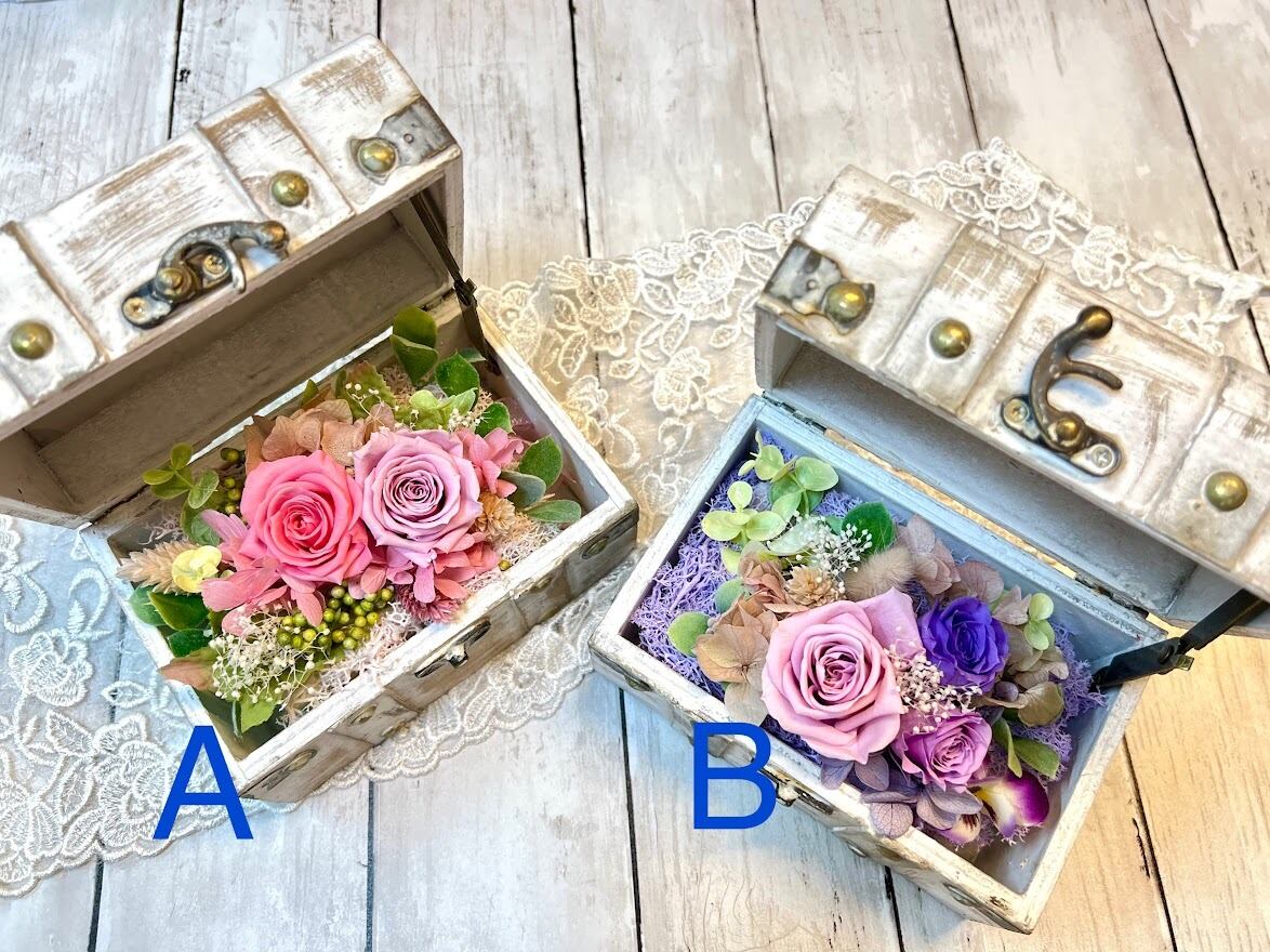 開閉できるアンティークなBOXの中にプリザーブドフラワーをアレンジしました。