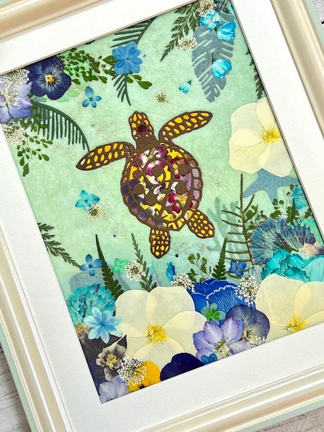 白いプルメリアの花がトロピカルな雰囲気いっぱいの押し花額です。