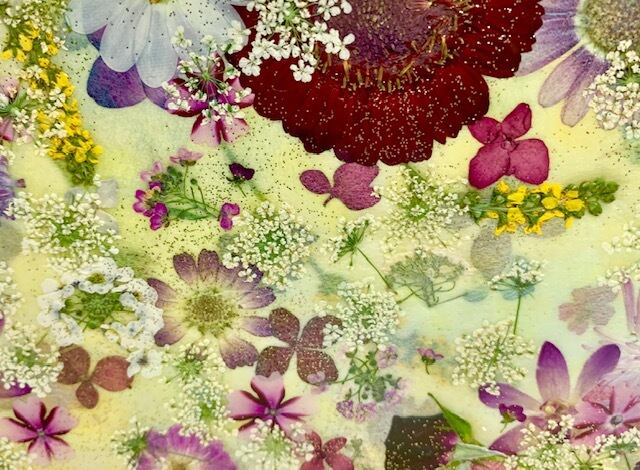 よく見ると何重にも重ねた和紙の間にもたくさんの小花が入っていて、幻想的な雰囲気の押し花額です。