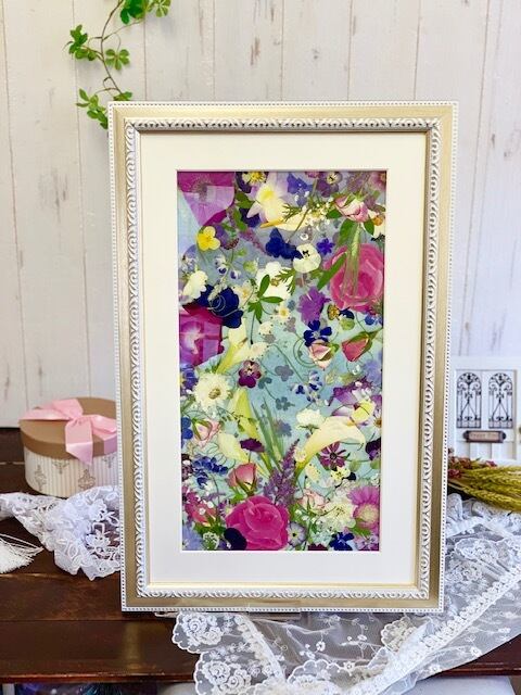角度によっていろんな表情が楽しめるお得感のある押し花アート額です。