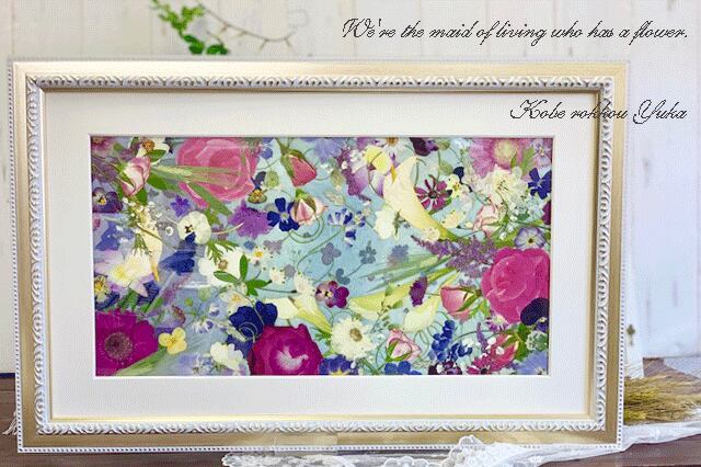 ゴージャスなゴールドとホワイトフレームの中にたくさんの押し花が舞っています。