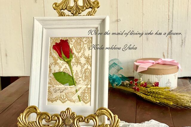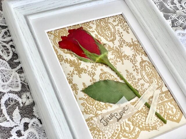 プレゼントにぴったりな赤い薔薇のつぼみの入った小さな押し花フレーム額です。