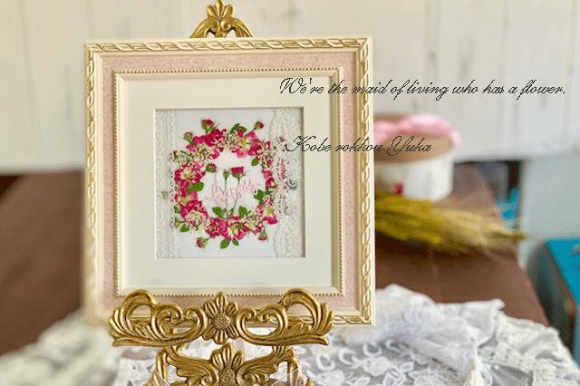作ったリースがとても甘い雰囲気の押し花アートフレームです。