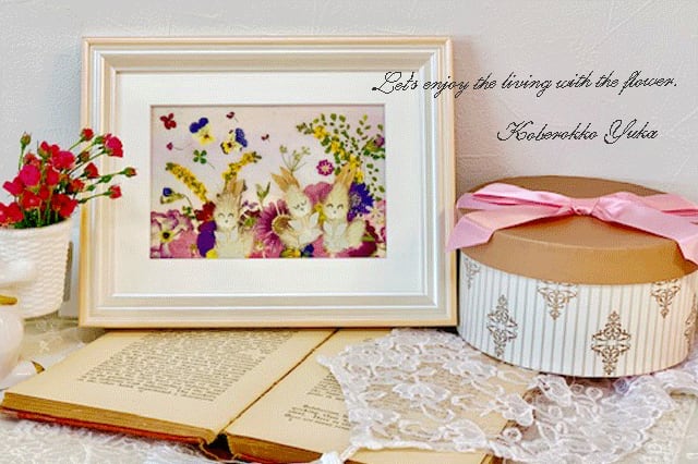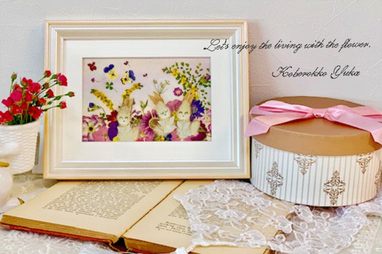 ホワイトパールオレンジのフレームにちょこんと仲良しウサギさんが微笑ましい押し花アートです。