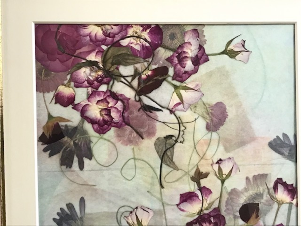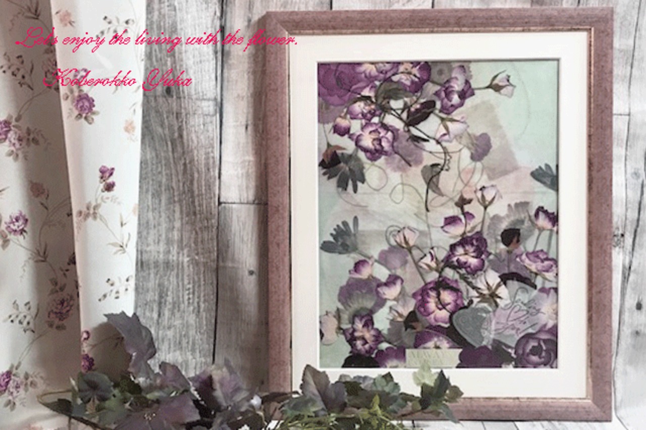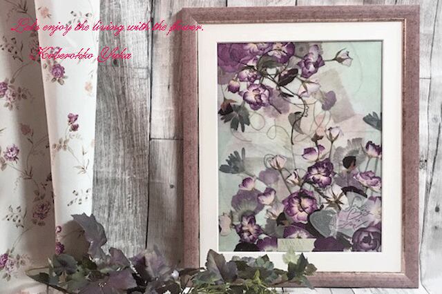 全体的に落ち着きのある雰囲気でありながら、遠近感のある華やかな薔薇の表情がおしゃれな押し花アートです。