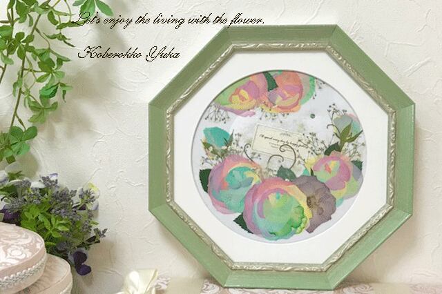 パワーストーン入り レインボーローズの八角形 押し花アート 額