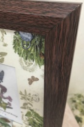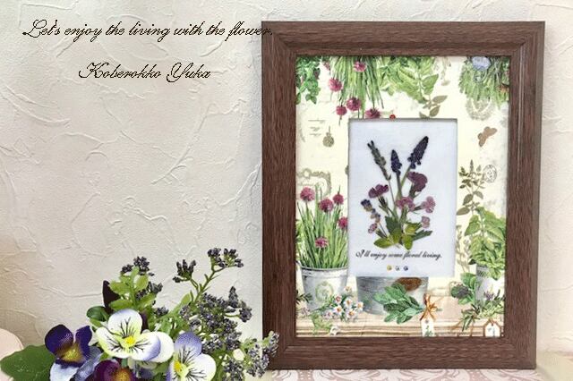 額縁のフレームをラベンダー柄に手作りしました。画面の押し花ムスカリやナデシコをおしゃれに引き立てています。