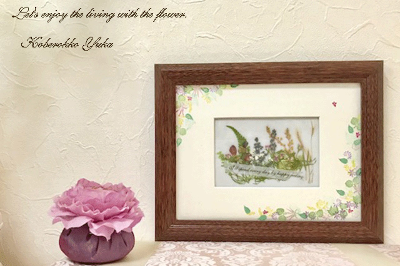 落ち着いたブラウンの額に可憐な野の花押し花がおしゃれにデザインされたインテリアフレームです。
