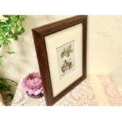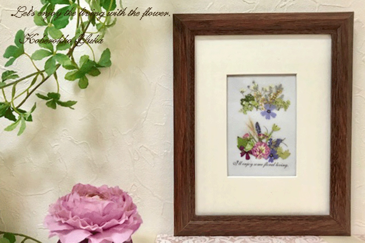 落ち着いたブラウンの額に可憐な野の花押し花がおしゃれにデザインされたインテリアフレームです。