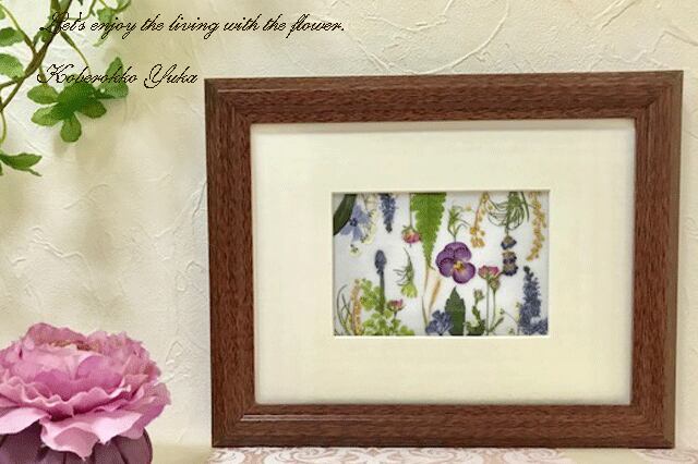 落ち着いたブラウンの額に可憐な野の花押し花がおしゃれにデザインされたインテリアフレームです。