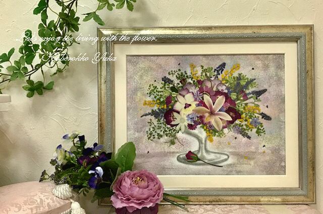 幾重にも塗り込んだパステルの重厚感と華やかな押し花がとてもよく合っています。