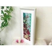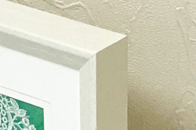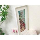 真っ白な額縁とグラディエーションの緑・バラの紅がとてもバランスよくデザインされたオシャレな押し花額です。