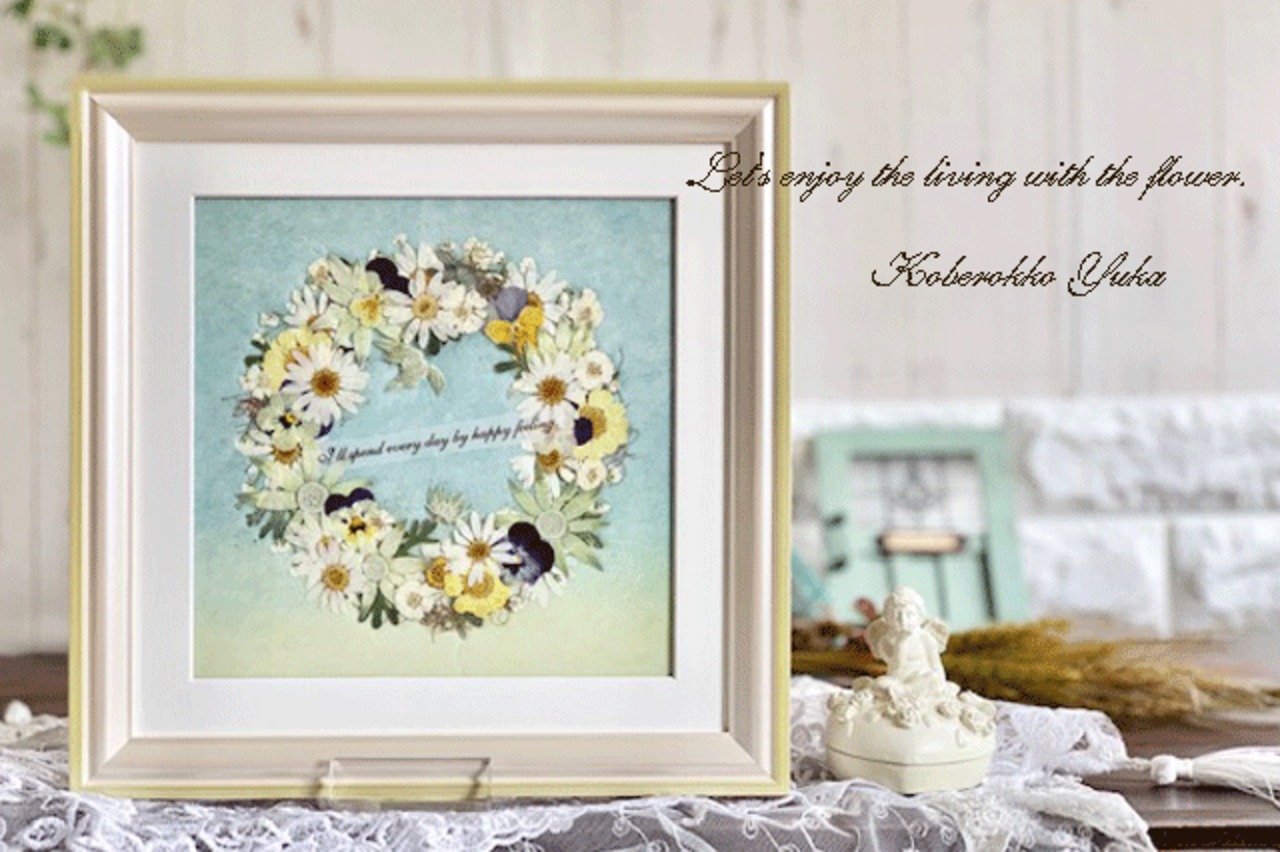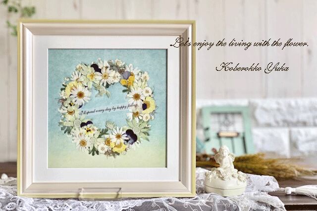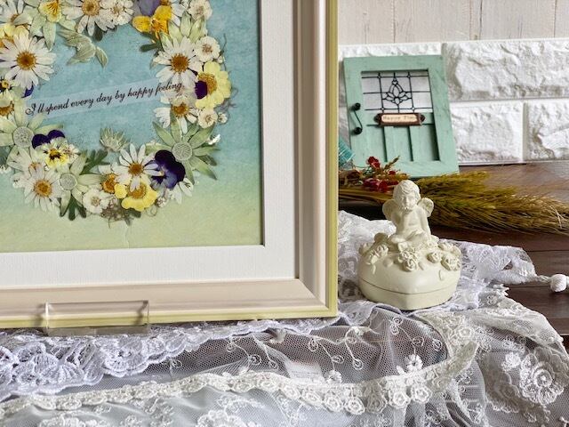 作ったリースがとても甘い雰囲気の押し花アートフレームです。