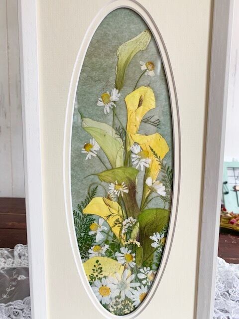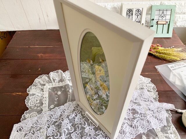 真白なフレームにアイボリーの二重中マットがオシャレなカラーの押し花額です。