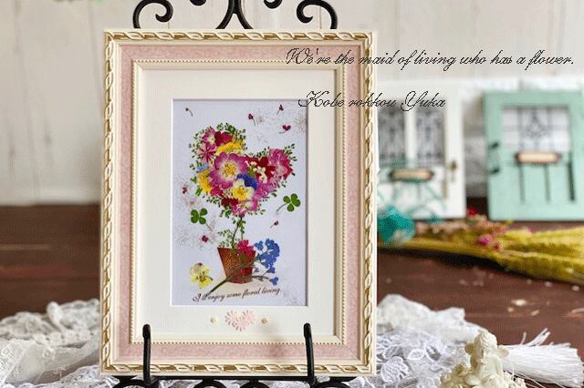 ハートフルな心癒される淡ピンク系の色で統一された押し花アート額です。