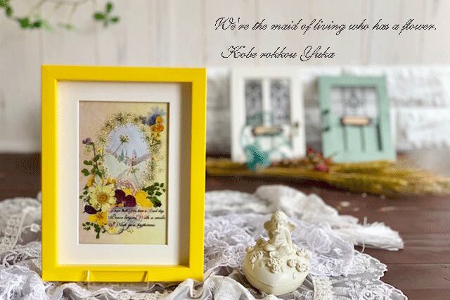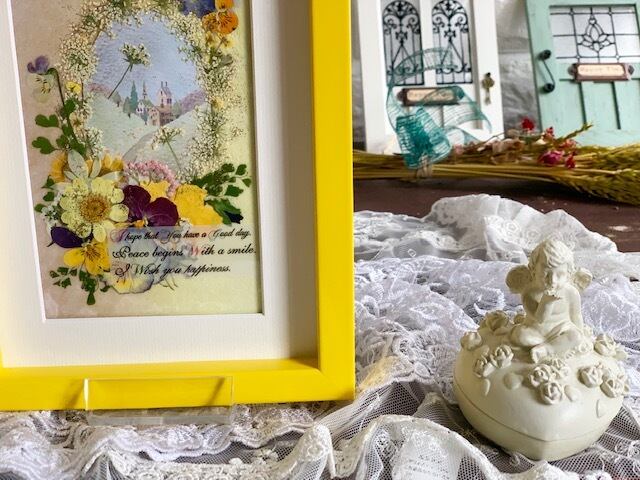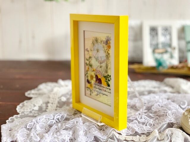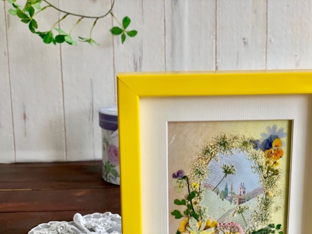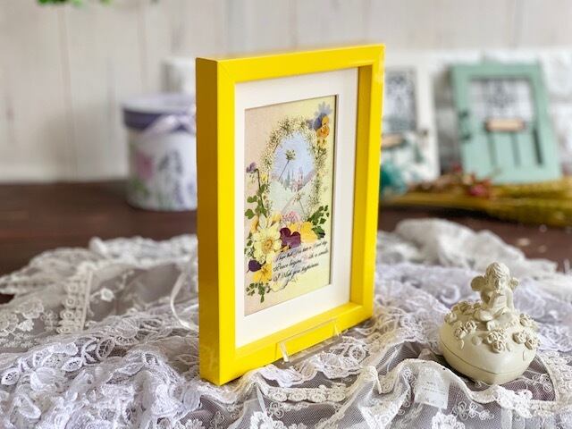 珍しい黄色のフレームに黄色系の押し花でアンティーク風にデザインされています。