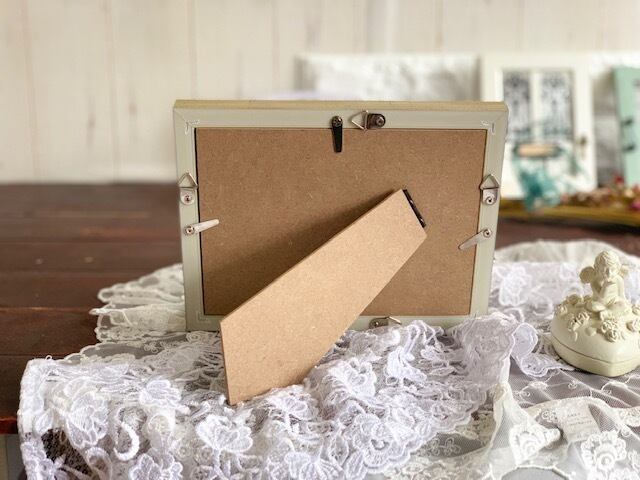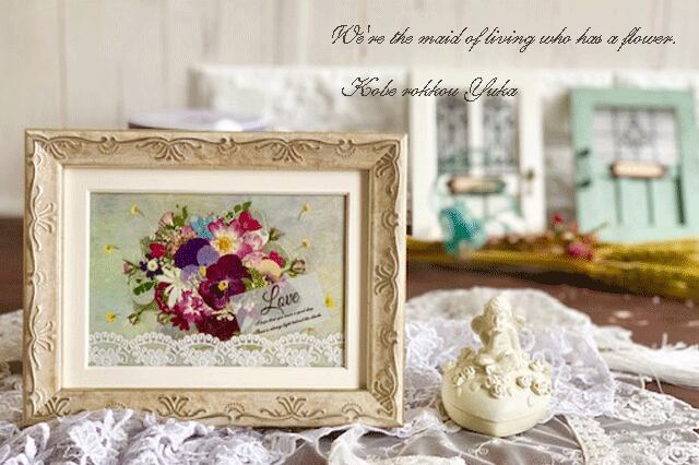 どっしりとした重厚感のあるアンティークフレームの中に、かわいい小花の押し花で