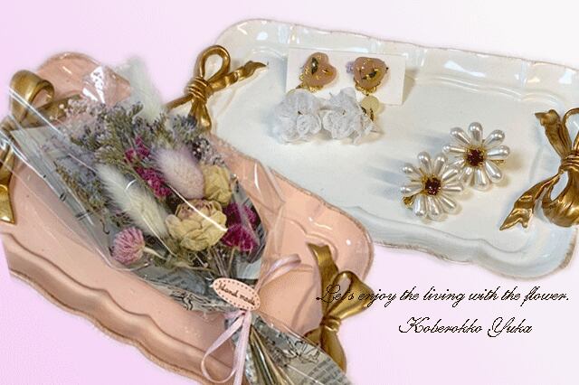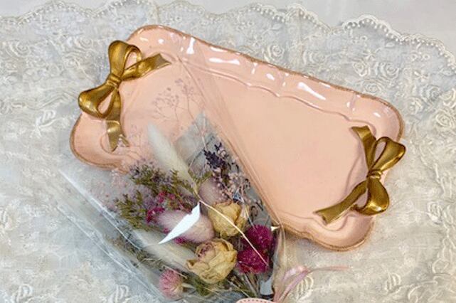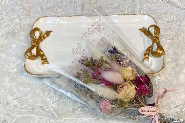 そのままトレイに載せて飾ったり、ブーケだけ壁にかけて飾ったりと