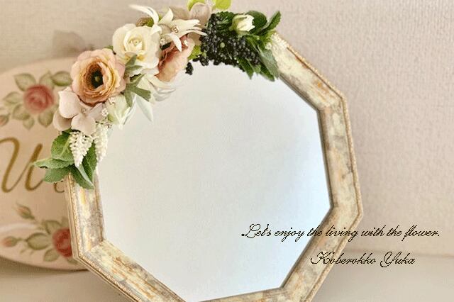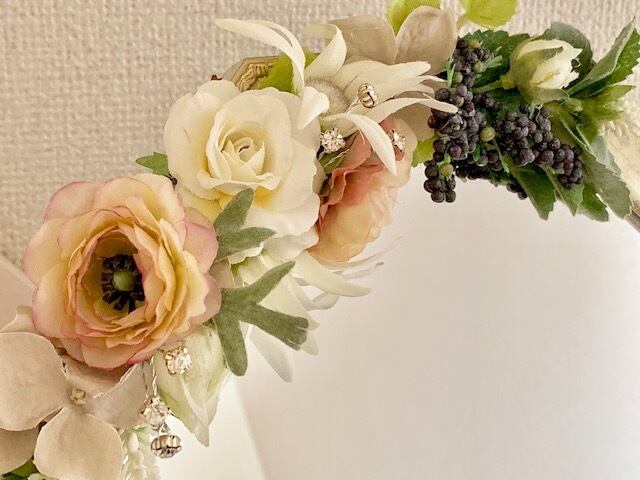 アンティークホワイトに大人っぽい優しい色合いのアートフラワーがデザインされています。