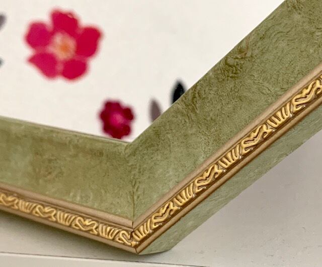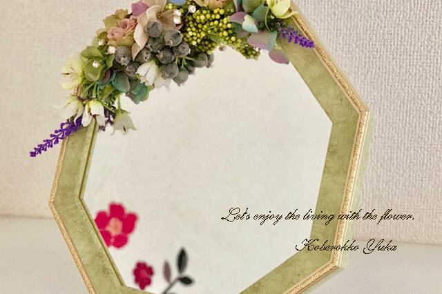 アンティークグリーンに大人っぽい優しい色合いのアートフラワーがデザインされています。