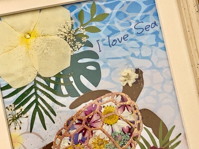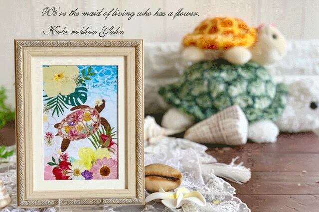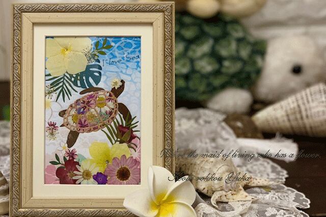 幸せ運ぶ青い海のウミガメ 押し花額 ブラウンタイプ