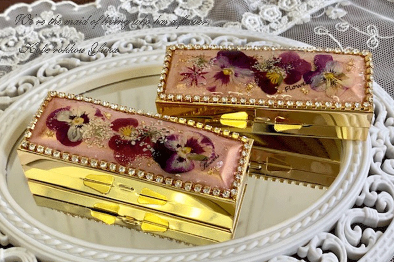 パールゴールドの台紙に可憐なビオラやレースフラワーの押し花がデザインされています。