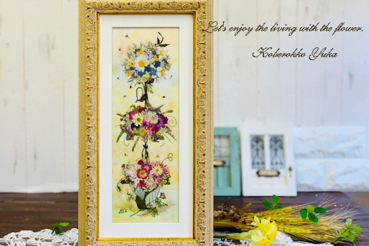 アイボリーがかった上品なゴールドの額に、押し花でデザインされた3連のトピアリーがとてもおしゃれです。
