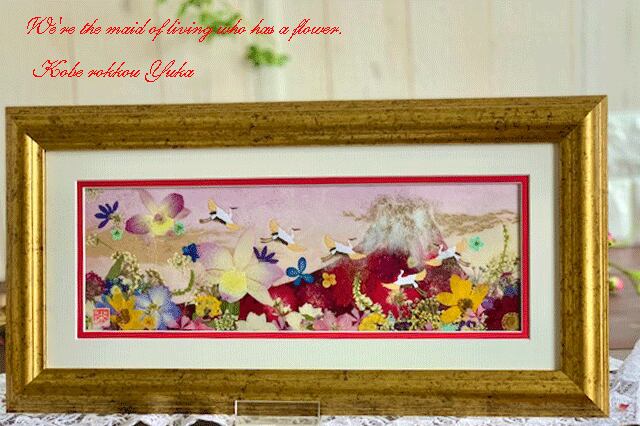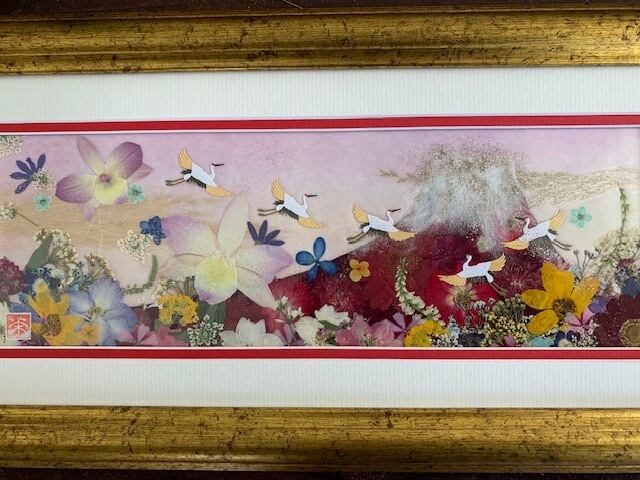 縁起の良い押し花額 5羽の鶴がはばたく赤富士押し花アート 栄 03