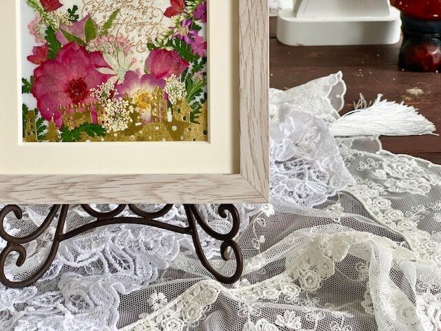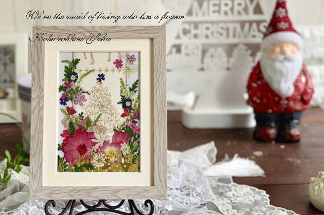 シンプルで素朴なフレームと中の華やかなリボンがオシャレな押し花アートクリスマス額です。