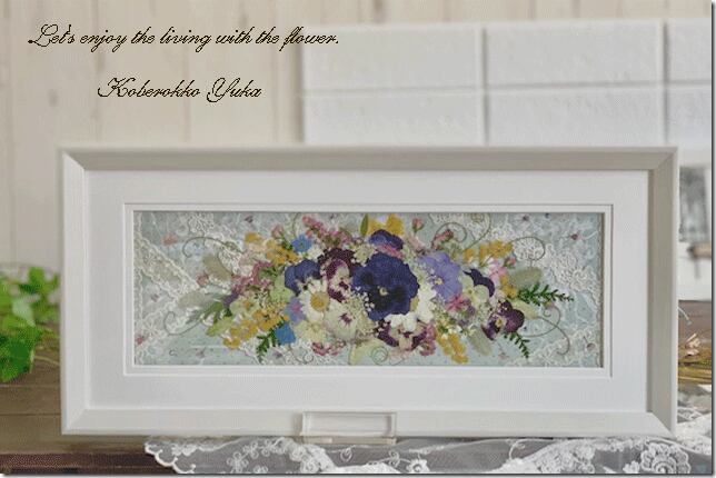 真っ白なフレームと白のダブル中マットかとても清楚な押し花額です。