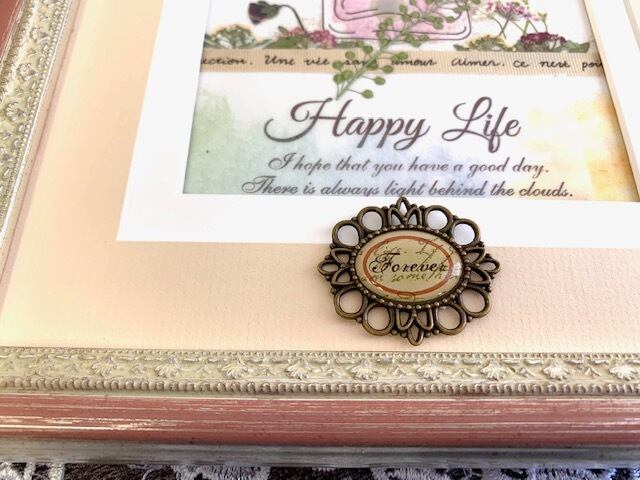 アンティークピンクのおしゃれな額にお花で香水瓶がデザインされています。