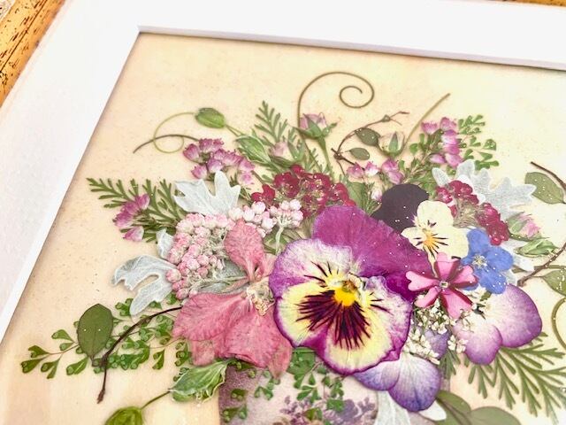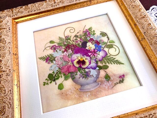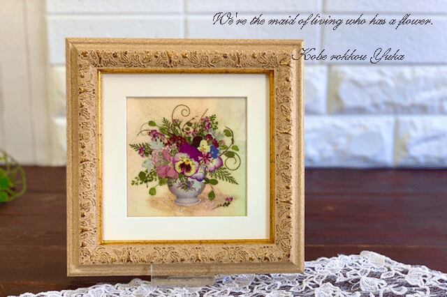 アンティークゴールド華やかな額に可憐で小さな押し花がおしゃれにデザインされたインテリアアートです。