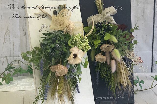 アンティーク風の壁飾りにアートフラワーとドライフラワーで作ったスワッグが飾られた、