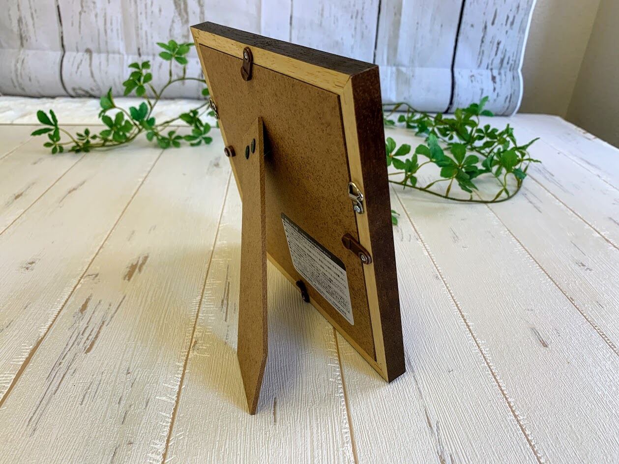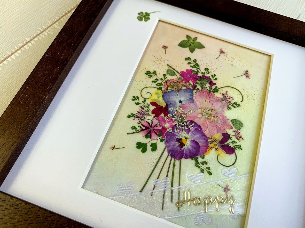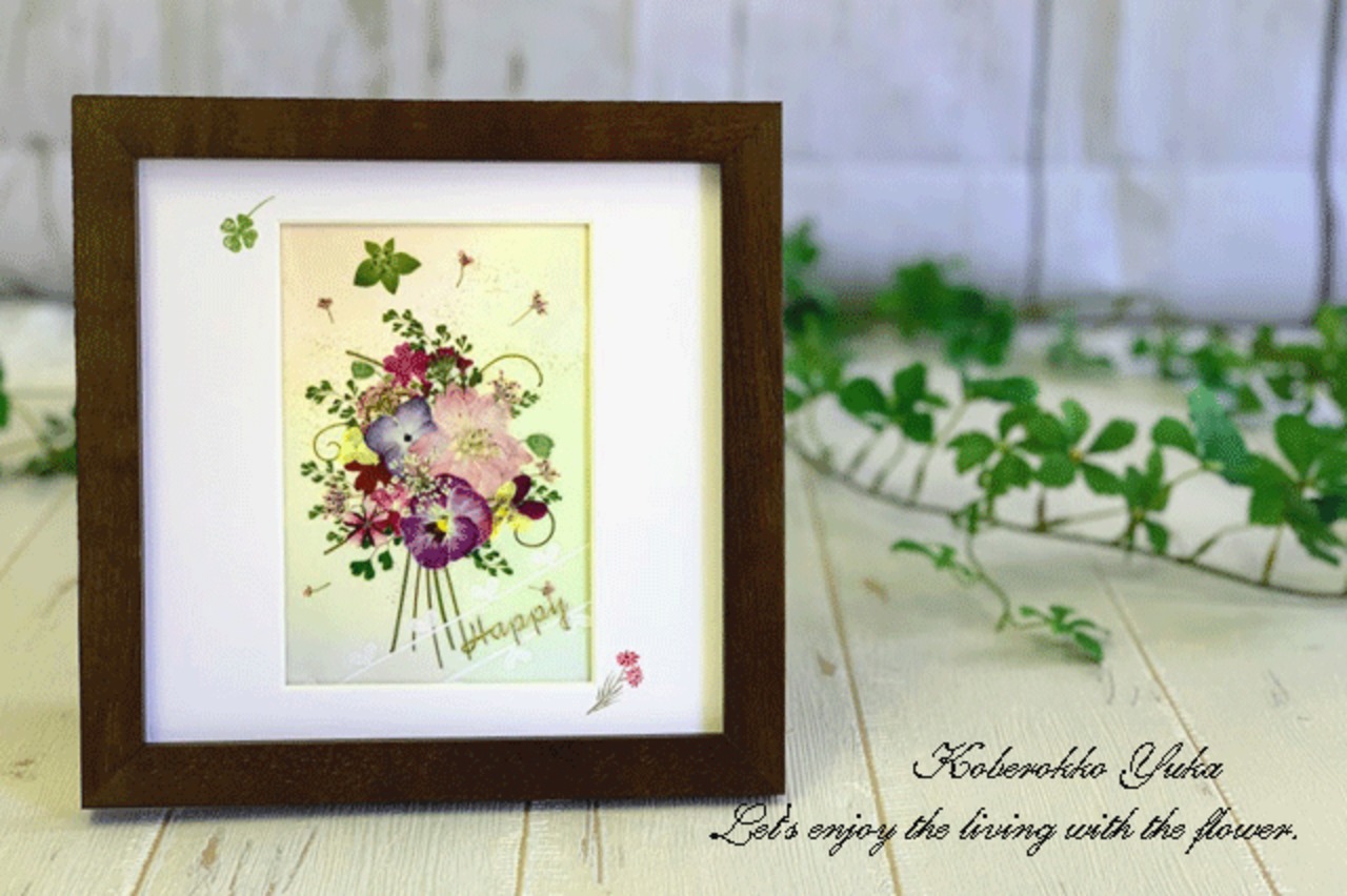 ブラウンのフレームに可愛い押し花が花束風にデザインされています。