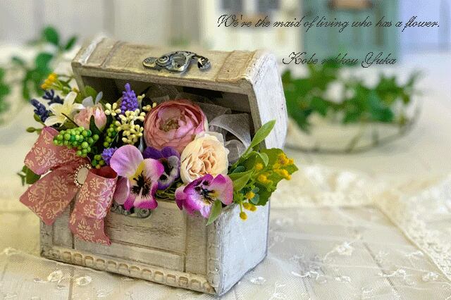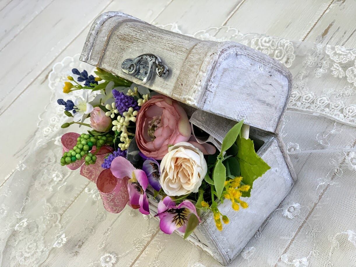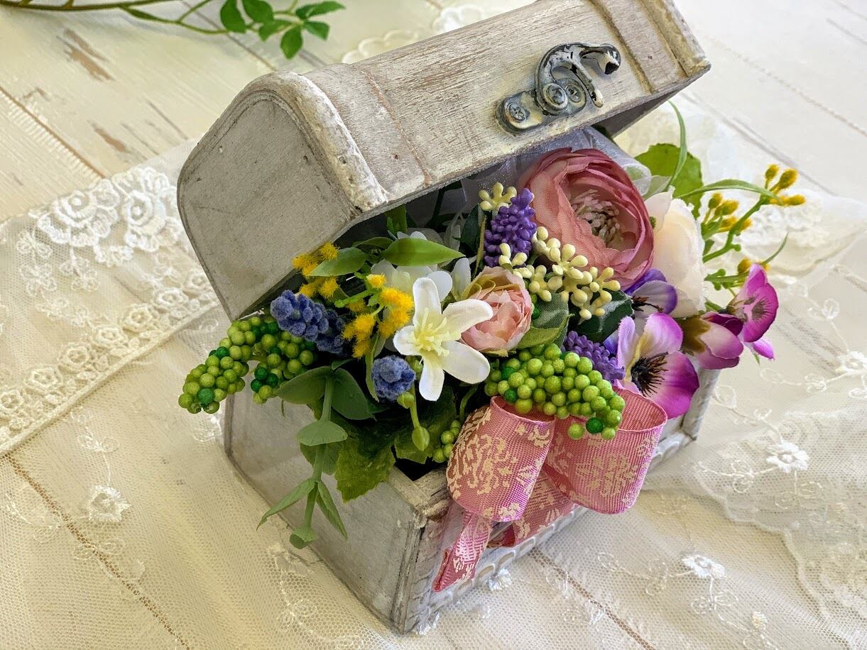 アーティフィシャルフラワーで飾ったアンティーク風のボックスがおしゃれです。