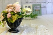 優しいベビーピンクと白・グリーンが重厚感のある花瓶とピッタリ。