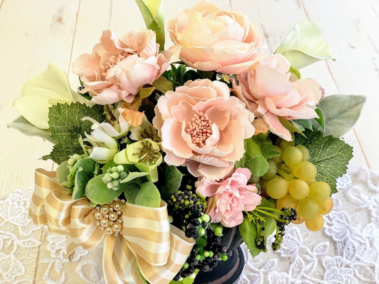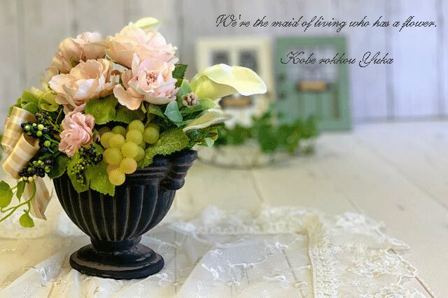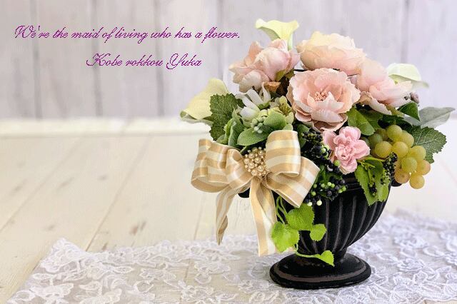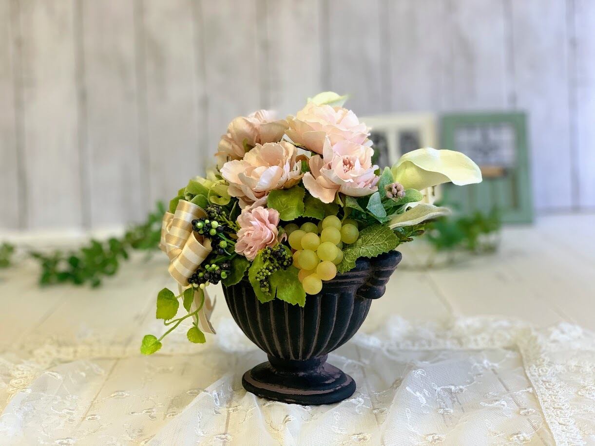 アンティーク風の黒い陶器の花瓶に盛りだくさんのアーティフィシャルフラワーがデザインされています。