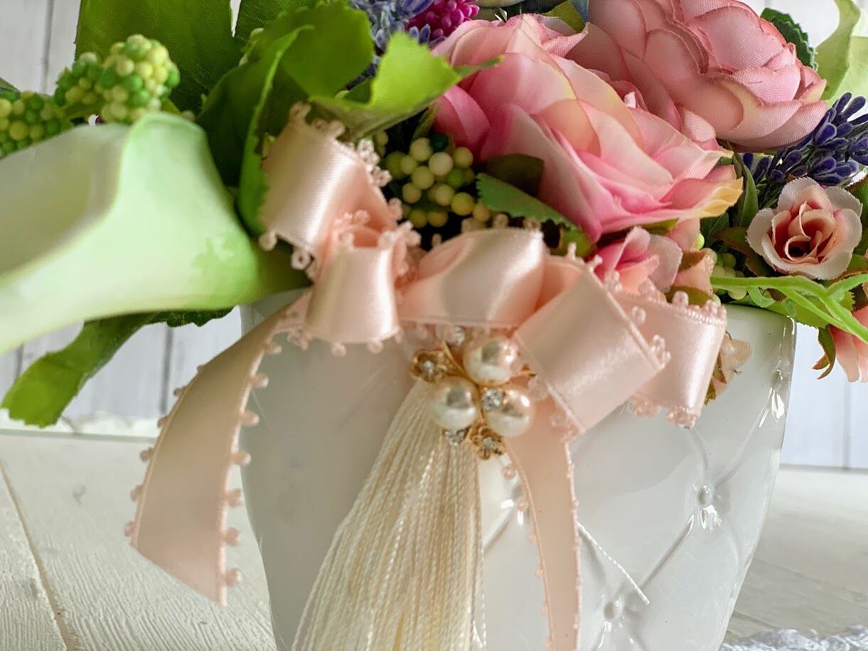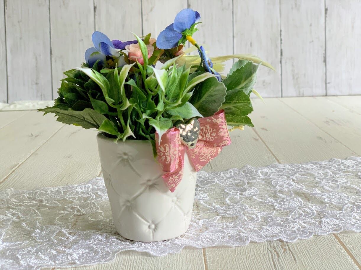 キルティング風の純白陶器にアートフラワーがおしゃれにデザインされています。