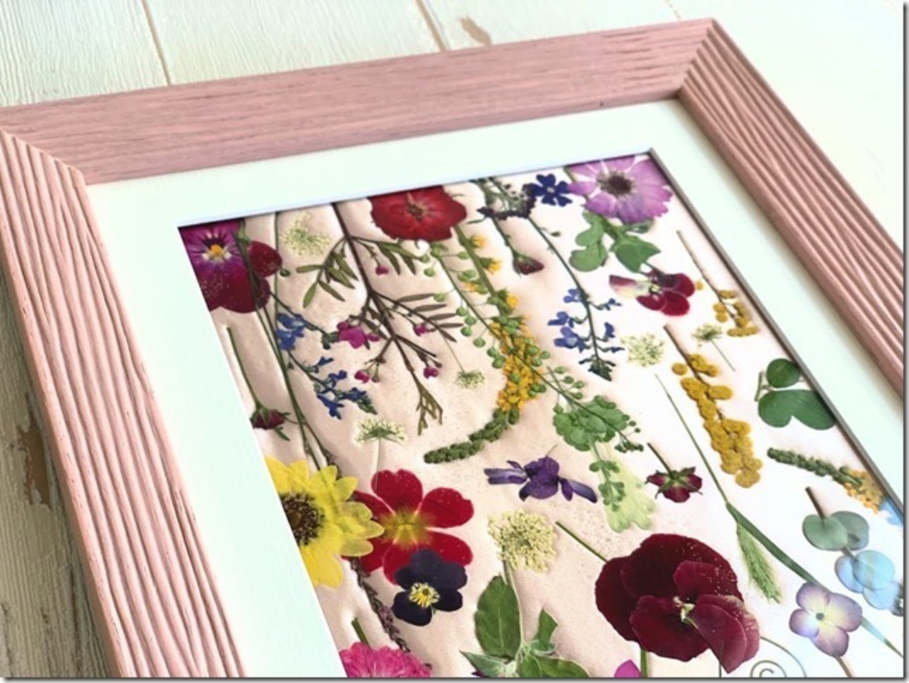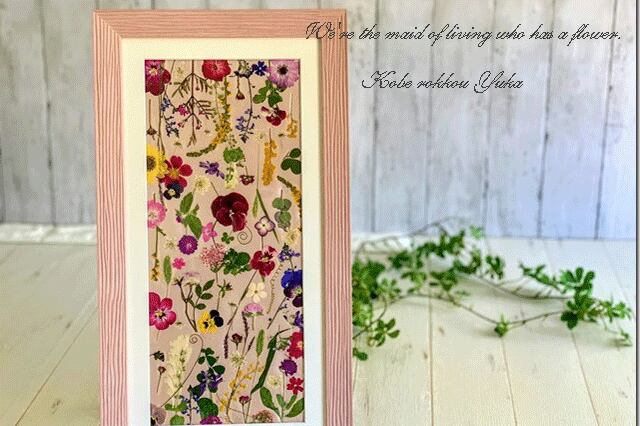 木製の優しいピンクフレームの中には、甘いピンクの光沢布地をバックにたくさんの押し花が表情豊かにデザインされています。