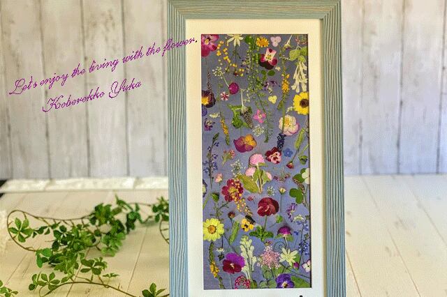 木製の優しいピンクフレームの中には、甘いピンクの光沢布地をバックにたくさんの押し花が表情豊かにデザインされています。