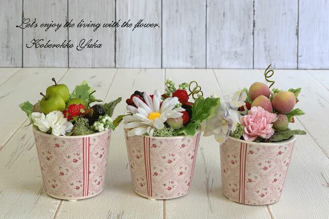 可愛らしい小花の地模様が入った小ぶりの花器にアートフラワーアレンジが3種類。