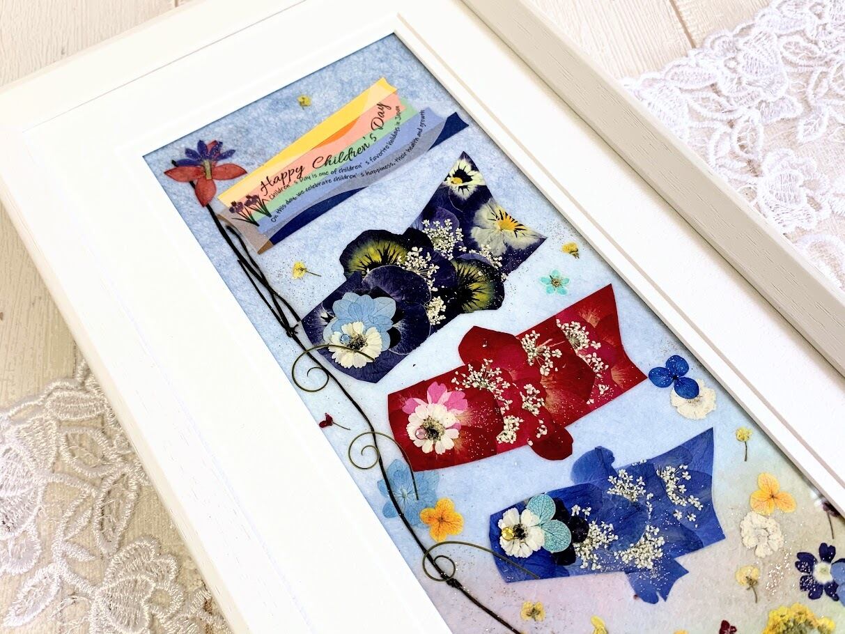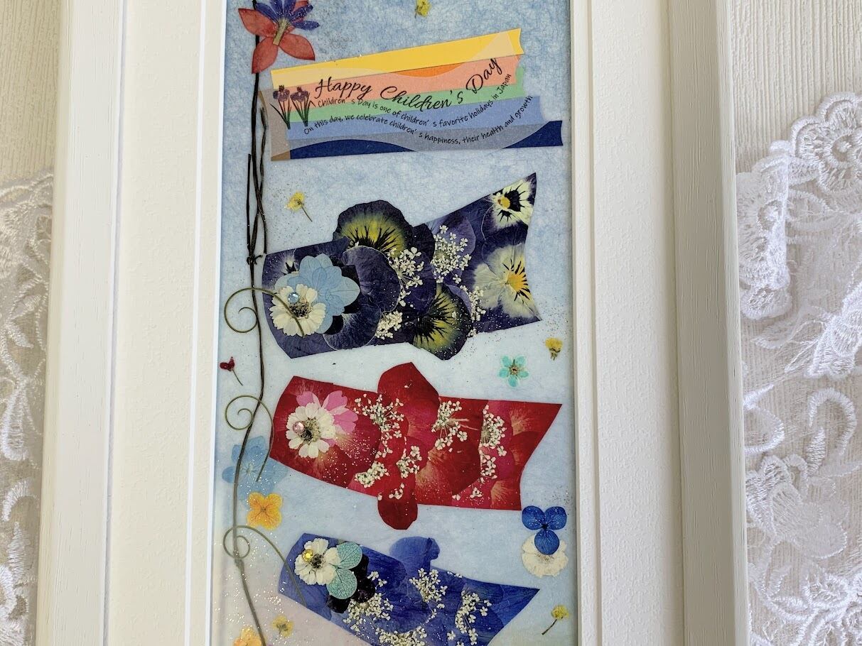 お花の鯉が青空に泳いでます。鯉のぼり押し花アートインテリア額