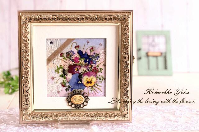 シルバーフレームと淡いパープルの台紙に押し花がとても上品な押し花額です。