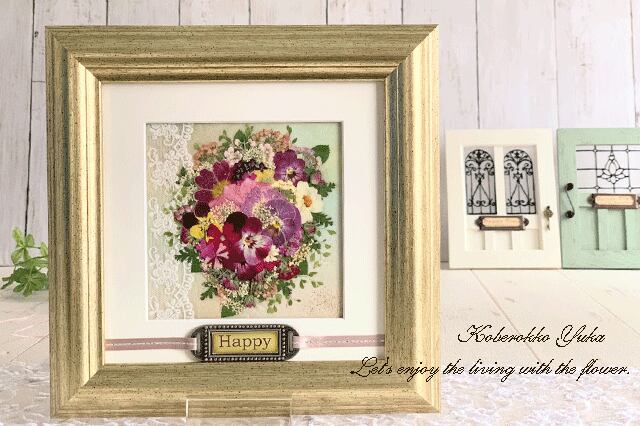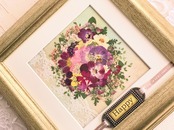 淡いパステル系の台紙とアンティークゴールドフレームに押し花がとても上品な押し花額です。