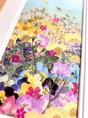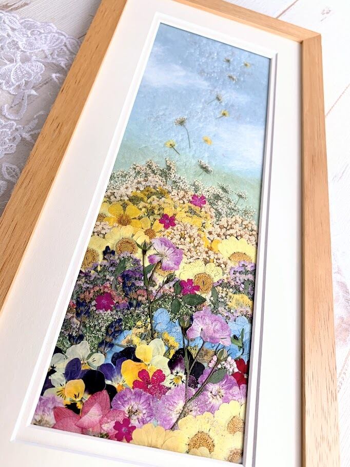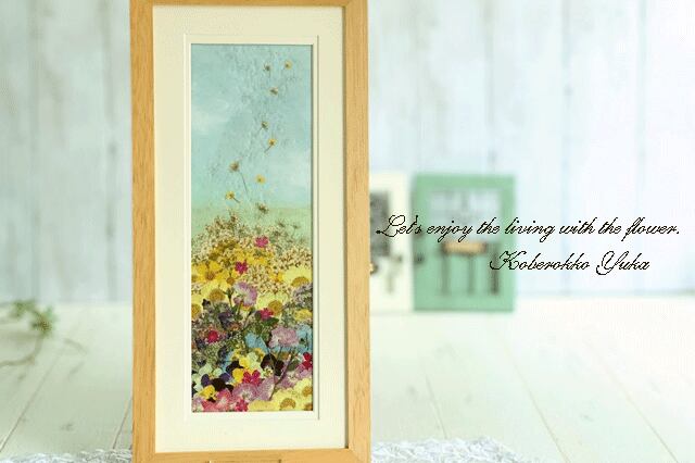 青空と緑の野原に押し花が風に吹かれている自然感一杯の押し花額です。
