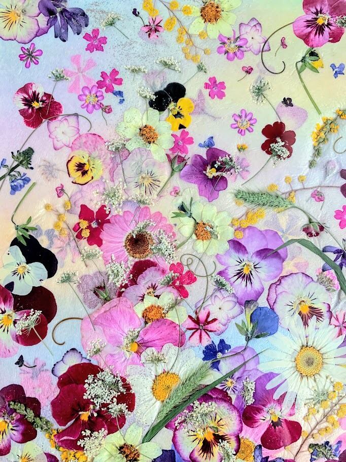 淡い虹色台紙の上にたくさんの可愛い小花が舞っています。とても心和む押し花額です。