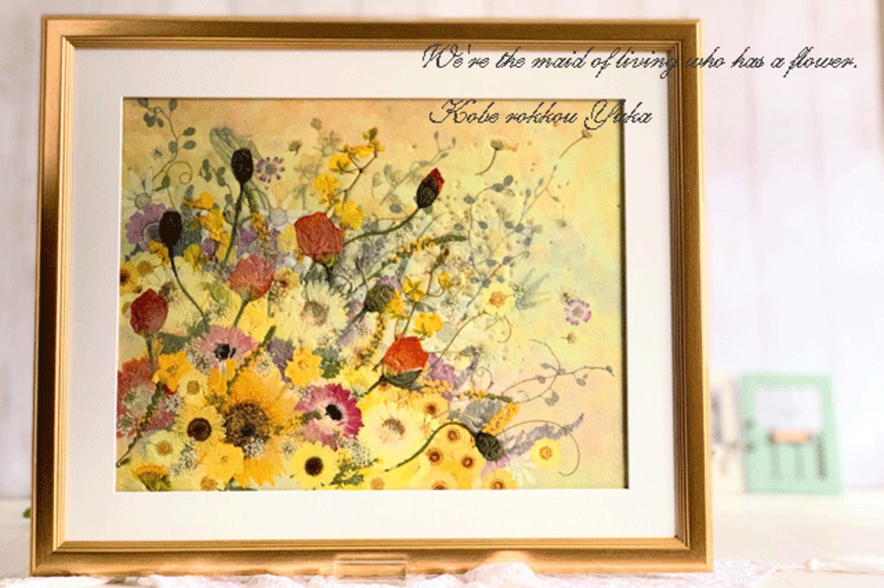 金色に輝くゴールドのフレームの中に、イエロー系の押し花がぎゅっとたくさん入った縁起の良い額です。