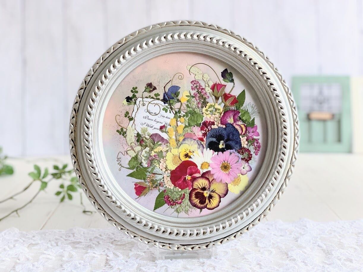 落ち着いたアンティークシルバーの珍しい円の押し花アート額です。