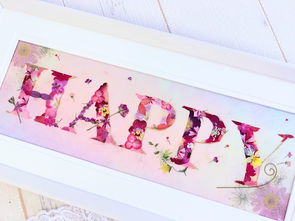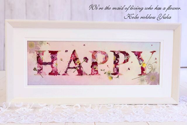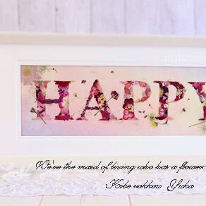 真っ白なフレームに可愛らしく押し花がHAPPY」とデザインされたとてもキュートな押し花額です。
