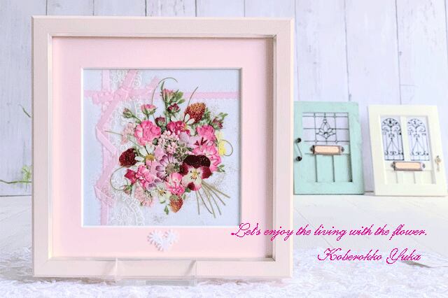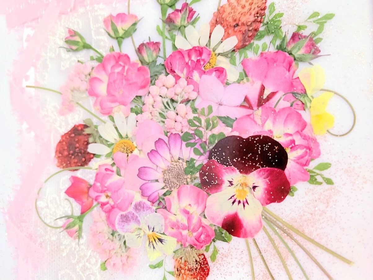 淡いピンクのフレームに可愛らしく押し花がデザインされたとてもキュートな押し花額です。